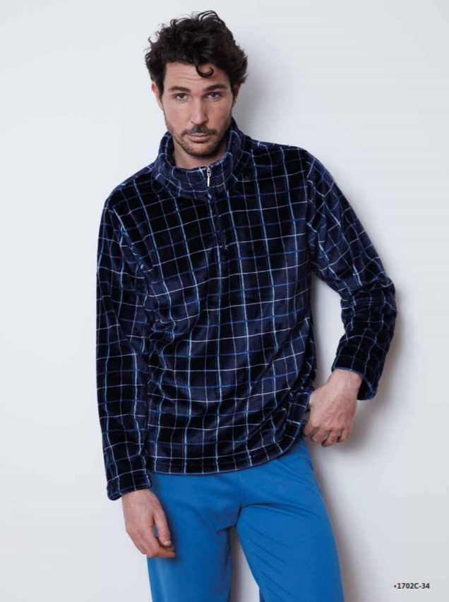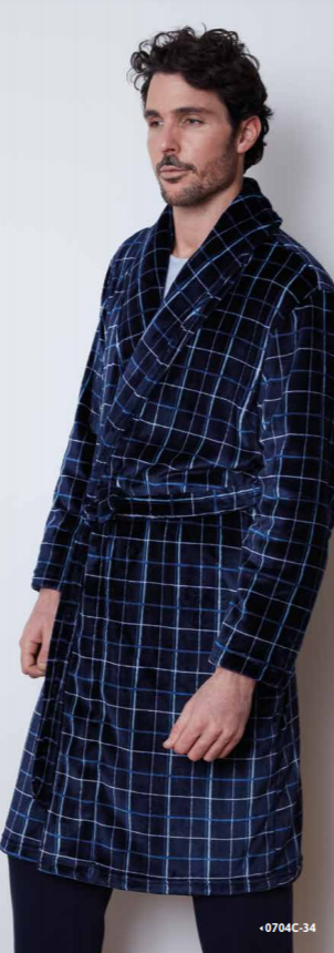 Bata aterciopelada de la casa Belty, diseñada en un estampado a cuadros en tonos azules.