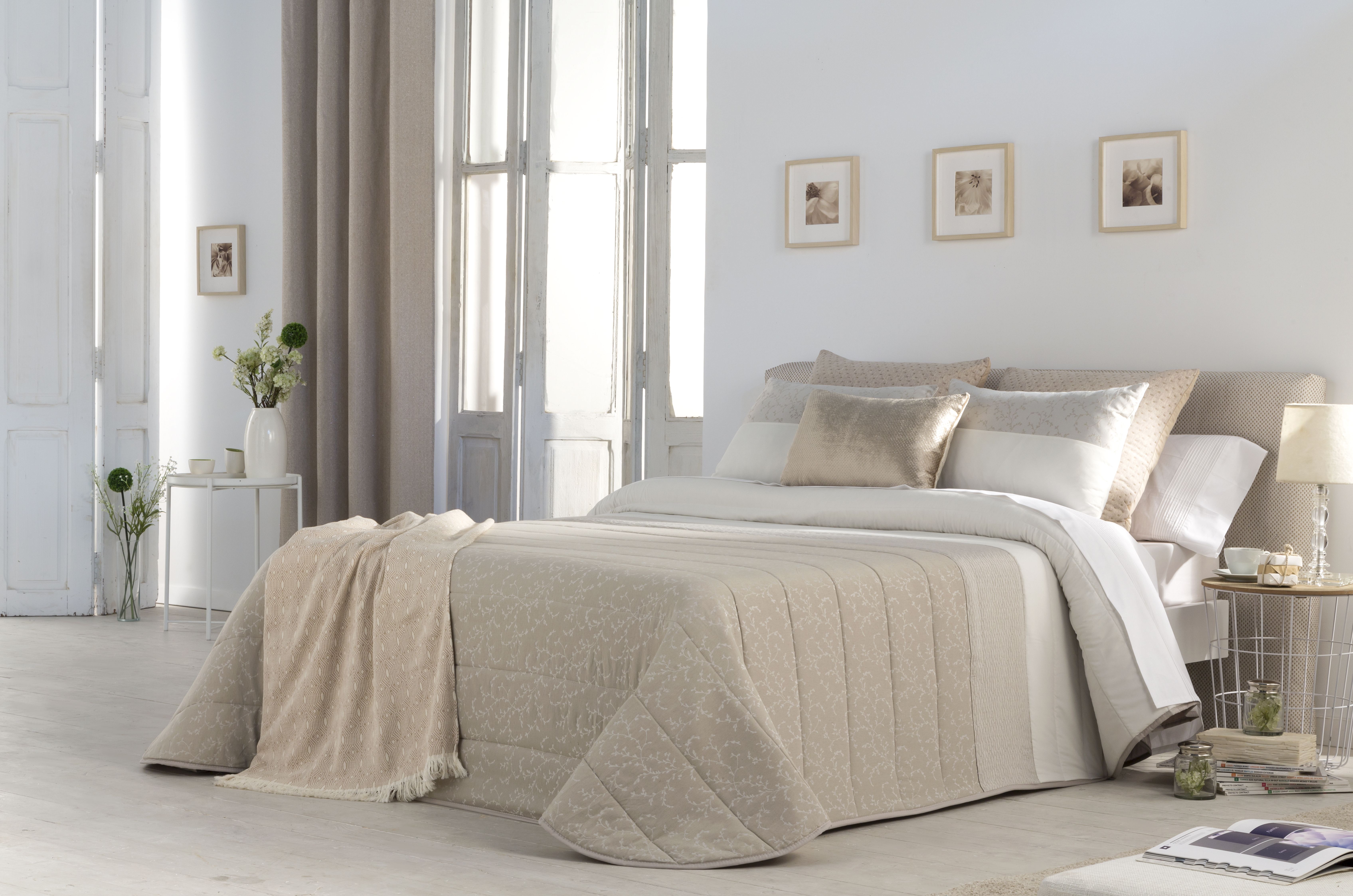 Colcha bouti con un estampado elegante que combina franjas lisas y franjas con un estampado muy sencillo y fino. Ideal para las estaciones de entretiempo por su grosor.