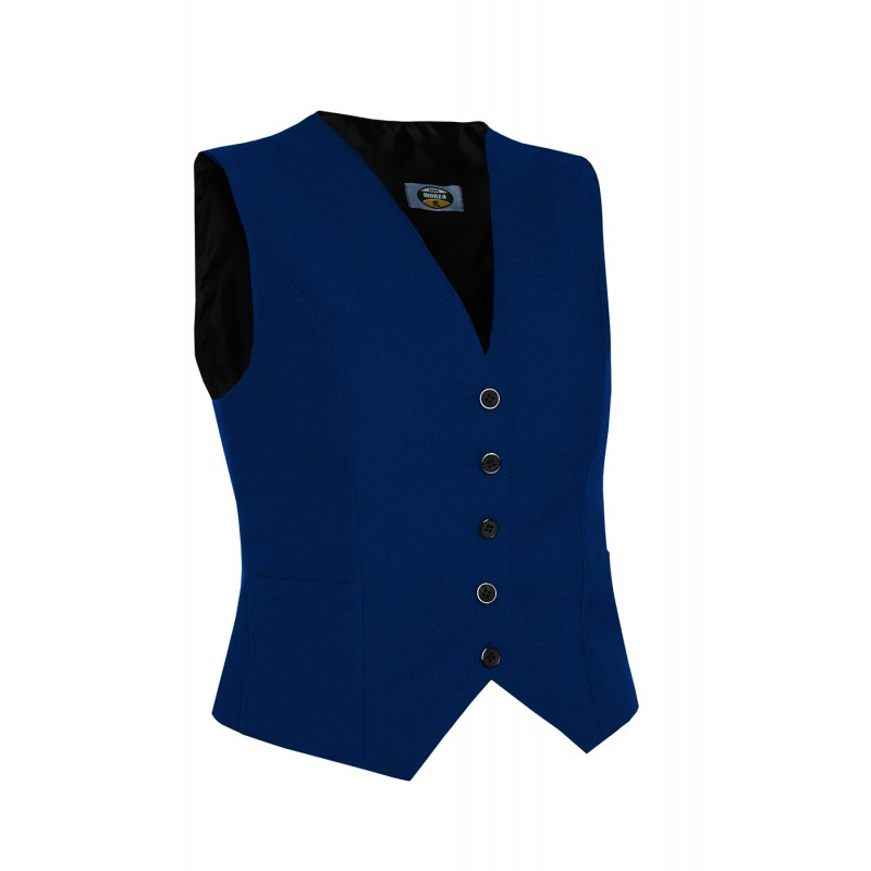 El chaleco es de señora y sin solapa. El delantero es entallado; costadillo francés; cierre central con 5 botones; 1 bolsillo de parche en costadillo de delanteros a la altura del talle; forrado. La espalda es entallada; costadillo francés; forrada. Cuello: escote en pico.