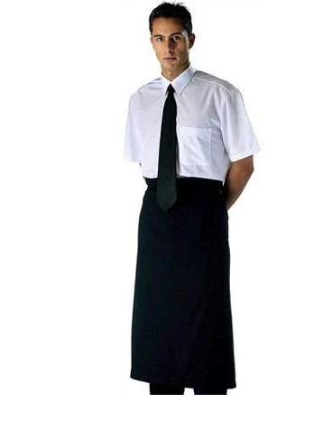 El delantal es francés y sin bolsillos. Forma de rectángulo; cintas de cintura.