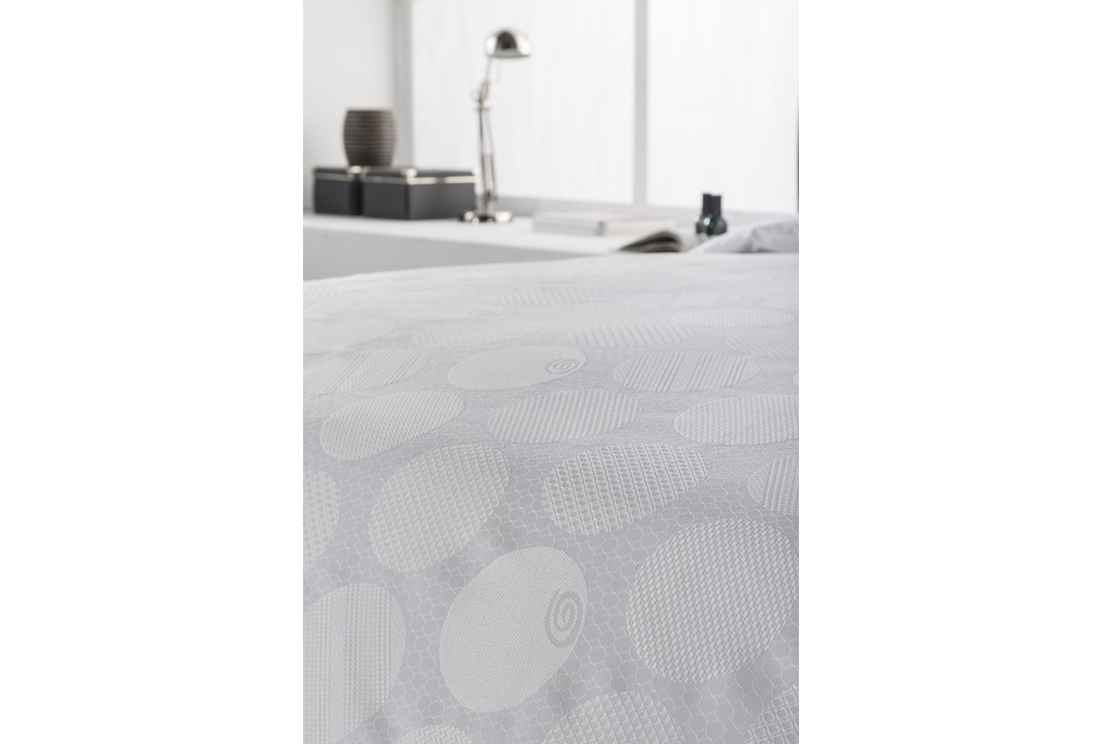 Juego de funda nórdica de 3 piezas con un elegantísimo diseño de estilo geométrico a base de círculos rellenos de diferentes texturas. Disponible en color blanco y gris.