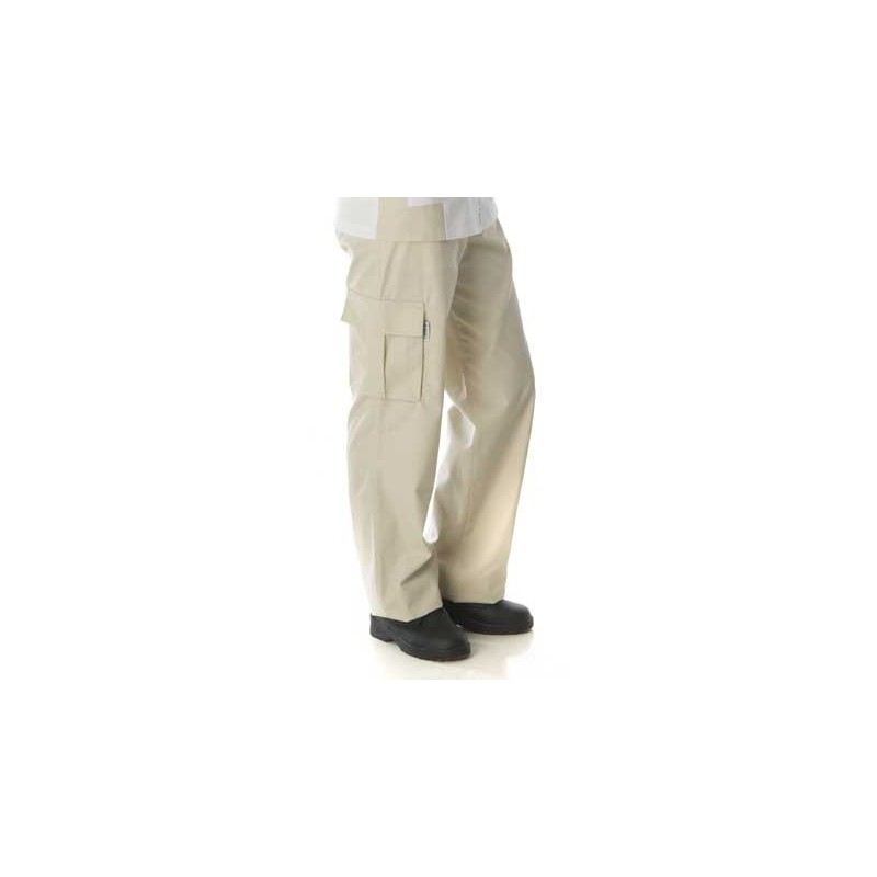 Es Straight Leg, con cintura elástica, bolsillos en costura, y bolsillo lateral con fuelle en pernera.
