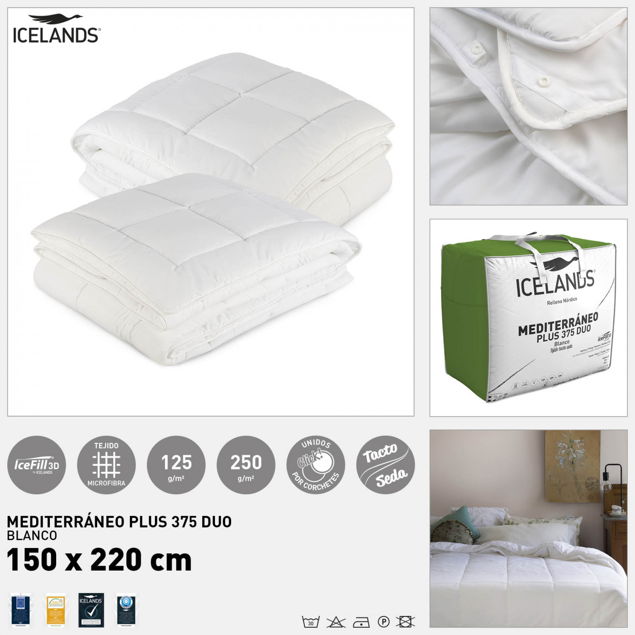 Relleno nórdico de fibra hueca siliconada 125+225 g/m2 y tejido de microfibra plus. Cosido de cuadros enmarcados. Se trata de dos rellenos de diferentes gramajes que se pueden unir mediante corchetes y nos permiten tres poderes calórificos distintos.