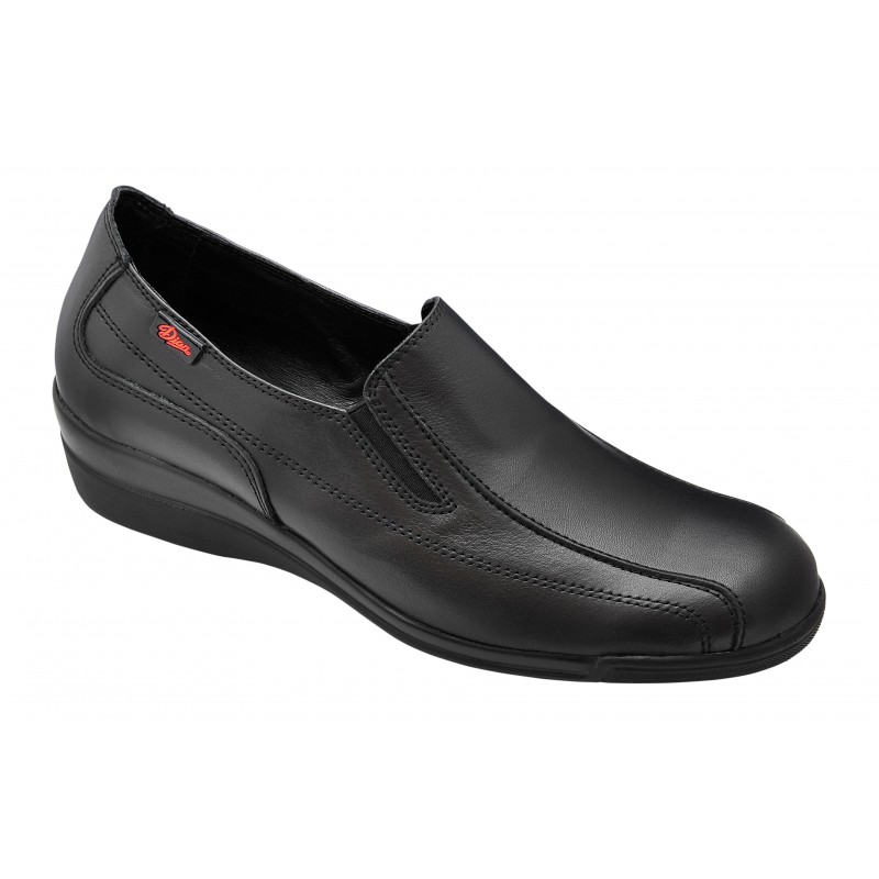 Zapato femenino de DIAN con cierre de elásticos laterales, de piel napa flor, forrado en la pala con microfibra técnica. Plantilla acolchada forrada con tejido técnico sobre espuma de poliuretano con tratamiento antibacterias y carbón activado. Suela de poliuretano de baja densidad antideslizante.